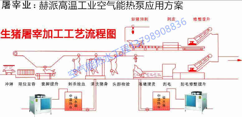 采用微電腦智能化控制系統(tǒng),設置電源相序、超高/低壓力、超溫、缺水、防冷凍及傳感器故障等保護,執(zhí)行低溫除霜功能,全天候全自動運行。專門針對高溫工業(yè)熱水工況而研發(fā)生產(chǎn)。滿足高溫出水,高溫回水加熱的特殊工況。比如 :電鍍廠電鍍液恒溫、印染廠高溫用水、屠宰場的圈欄沖洗、淋洗、屠宰及其它廠房地坪沖洗、燙毛、剖解、副食加工、洗油、工作人員淋浴等。其中,用到熱水的工藝有沖洗、燙毛、工作人員淋浴。同時屠宰場還有一些地方也需要控制環(huán)境溫度,如排酸間、二次包裝間、凍結(jié)間、冷藏間。與傳統(tǒng)的“電熱工藝”相比,采用赫派空氣能高溫熱水機組技術(shù)系統(tǒng),操作簡單穩(wěn)定,運行費用低,保證生產(chǎn)工藝流程正常運行。以加熱10T水(夏季水溫從15℃加熱到65℃,其他季節(jié)水溫從10℃加熱到65℃)為例,每年可節(jié)約16.25萬元。由此可見,赫派高溫熱泵機組更適合于以上行業(yè)高溫熱水的應用且節(jié)能效果相當明顯。