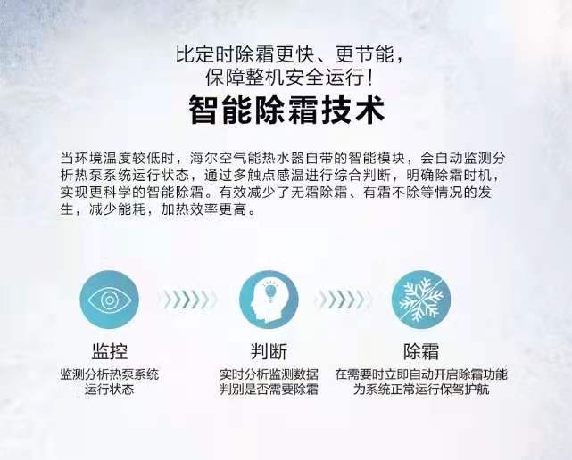 海爾空氣能熱水器全系列采用智能除霜,自動監(jiān)測分析熱泵系統(tǒng)運行狀態(tài),通過多觸點感溫進行綜合判斷,明確除霜時機,有效避免了”無霜除霜“或者”有霜不除“,加熱效率更高。