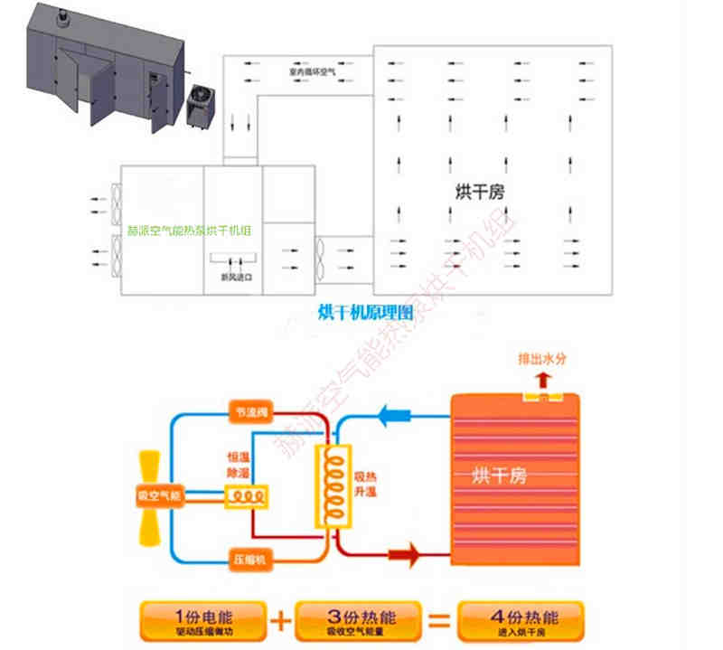 赫派空氣能熱泵烘干機(jī)只需要少量的電能來驅(qū)動壓縮機(jī),并通過壓縮機(jī)從空氣中吸收大量的熱能,通過循環(huán)風(fēng)機(jī)搬運到烘干房,不斷的循環(huán)快速升溫(烘干房內(nèi)可調(diào)溫度為:8℃-80℃,可調(diào)濕度:5%-95%),再利用二次廢熱回收除濕裝置排濕,從而達(dá)到物料烘干的目的。采用微電腦智能控溫控濕,烘干過程無需專員看守、無任何污染物排放,運行電費低,是一種節(jié)能環(huán)保的烘干解決方案。